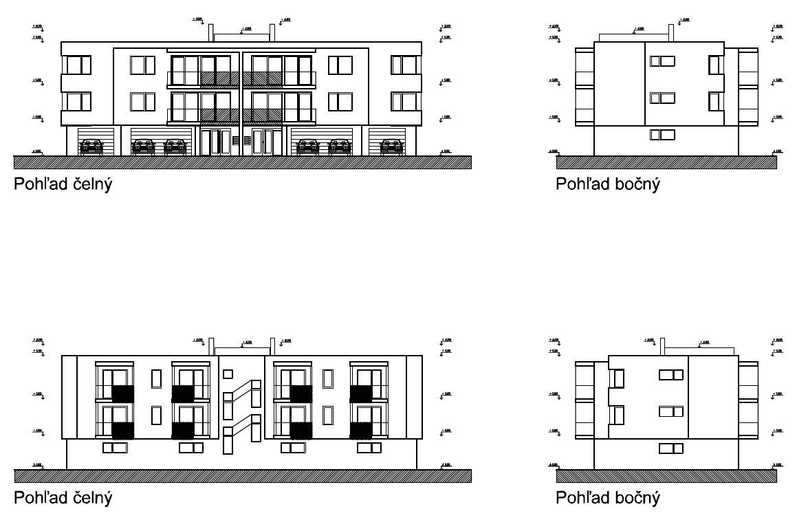 Štvorpodlažná samostatne stojaca budova s troma sekciami. Na 1.NP budú samostatné jednotlivé garáže pre 18 osobných vozidiel, okrem toho spolocné a pivnicné priestory obyvatelov domu. Komunikacným jadrom spájajúcim podlažia budovy budú vstupné haly s troma schodiskami.