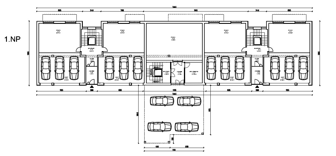 Pätpodlažná samostatne stojaca budova s troma sekciami. Na 1.NP budú samostatné jednotlivé garáže pre 12 osobných vozidiel, okrem toho spolocné a pivnicné priestory obyvatelov domu. Komunikacným jadrom spájajúcim podlažia budovy budú vstupné haly s troma schodiskami.