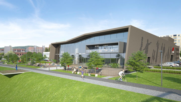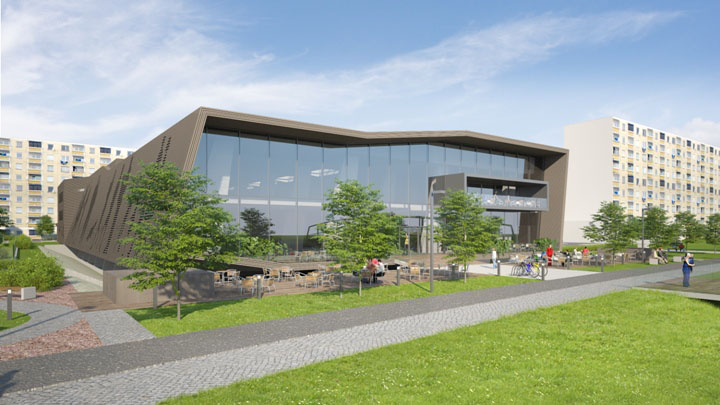 Architektúra objektu vstupuje do cieleného kontrastu s panelovou monokultúrou okolitých stavieb. Motív bude v nočných hodinách podsvietený a spolu s presklením juhovýchodnej fasády vytvorí zároveň reklamný pútač pre okolie. Cez sklenú membránu východnej fasády vedie stavba dialóg s okolitou prírodnou zložkou. Na fasáde, formou balkónov a pred ňou - na terasách sú navrhnuté pobytové exteriérové plochy naviazané na gastro prevádzky.