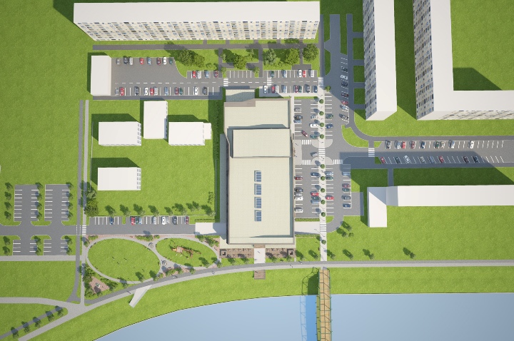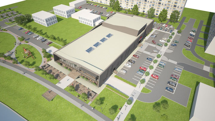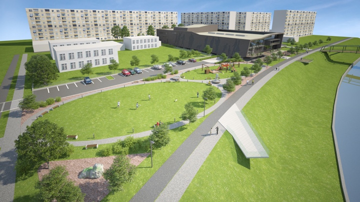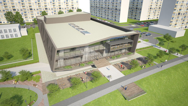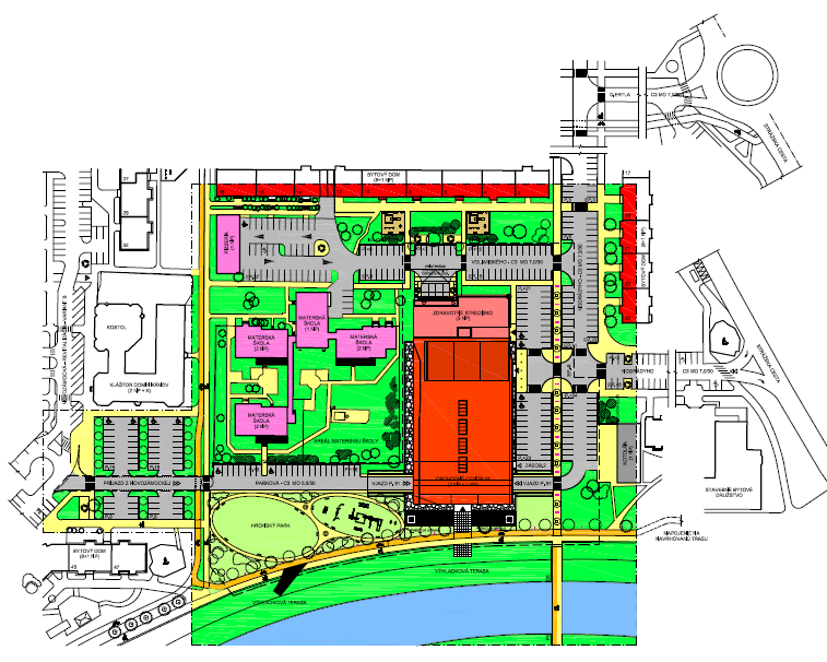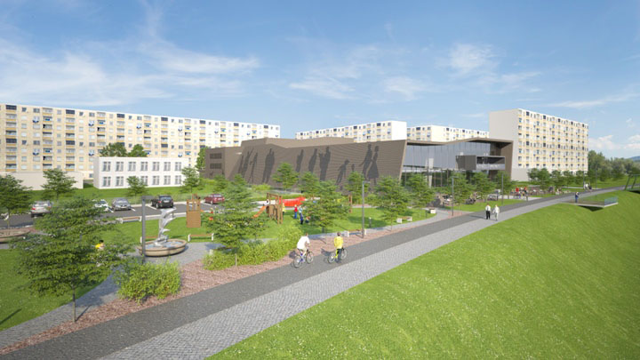 Z čitateľnej urbanistickej koncepcie sídliska Západ je umiestnenie polyfunkčného objektu v páse občianskej vybavenosti lemovanej zo severovýchodu Nográdyhou ulicou logické. Napriek jej „prerušeniu" bytovým domom na ulici Voljanského, tvorí toto územie so šírkou cca 180 m urbanisticky cielene vytvorené sídliskové centrum so sústredenou občianskou vybavenosťou, ktorú navrhovaný objekt ďalej rozvíja juhovýchodným smerom k rieke a doplňuje o chýbajúce funkcie. Zvažovaná funkčná náplň a cieľová skupina predpokladá prioritne návštevníka z priestoru sídliska, čo znižuje nároky na statickú aj dynamickú dopravu.