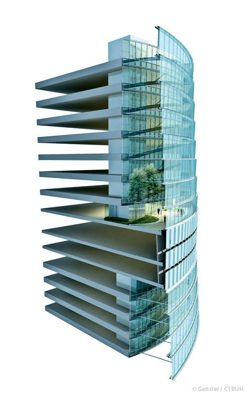 | Budova samotná pozostáva z deviatich zvislých zón, ktoré vytvárajú časti autormi označované ako „susedstvá“, vysoké 12 až 15 poschodí. Medzi každým takýmto susedstvom s nachádzajú átriá oddelené nezávislými predsadenými stenami (curtain walls). Funkcia priestoru medzi týmito stenami je v prvom rade znížiť energetické nároky budovy, ako izolačný plášť okolo budovy. Zároveň však zvyšuje kvalitu vzduchu, maximalizuje preslnenie objektu a zosilňuje vizuálne prepojenie okolitého exteriéru s obyvateľmi veže. Do tohto priestoru bude osadená zeleň, ktorá by mala vytvoriť akoby „záhrady v oblakoch“ pri ktorých budú umiestnené obchody a verejné miesta v rámci budovy. | ![]() |
