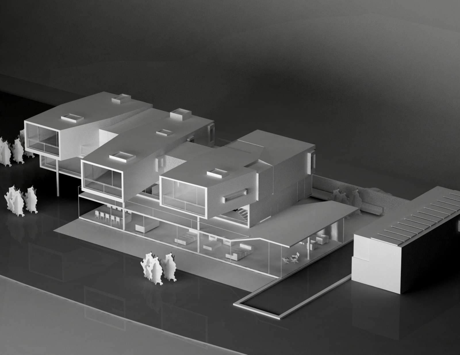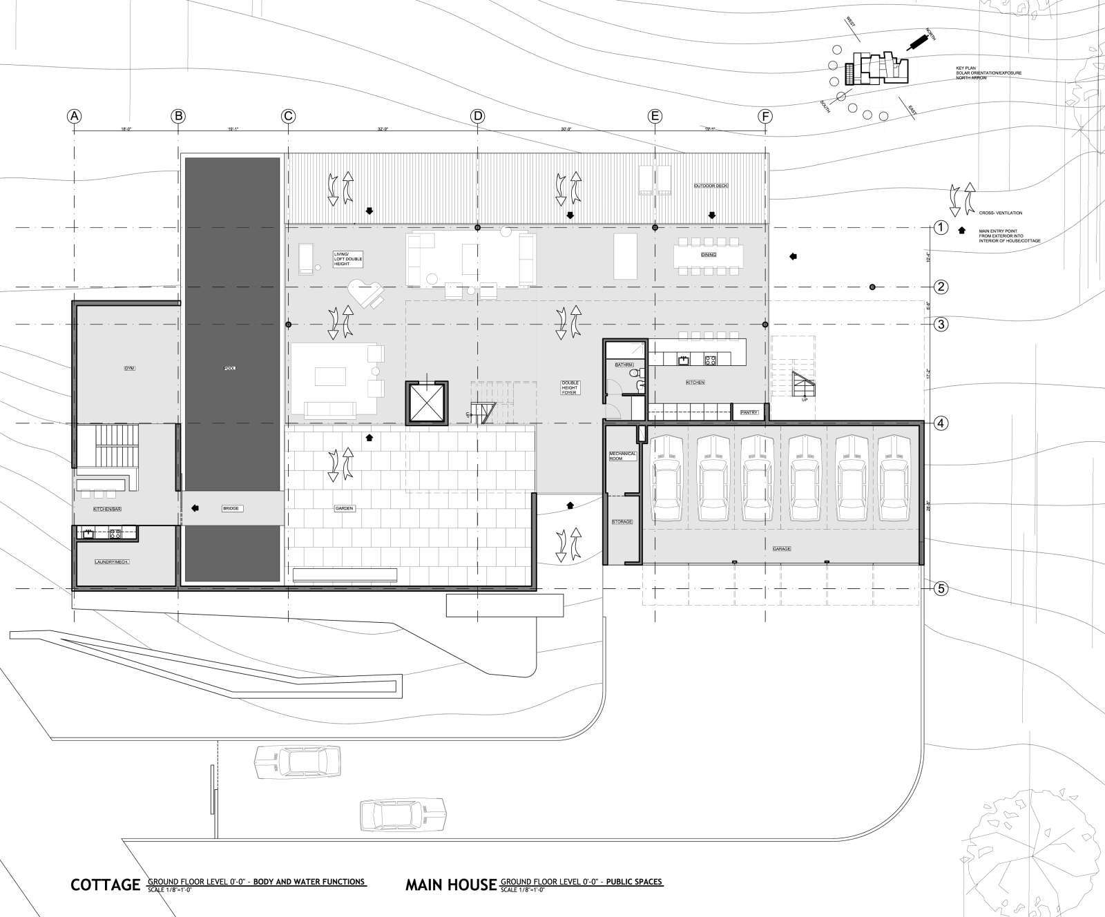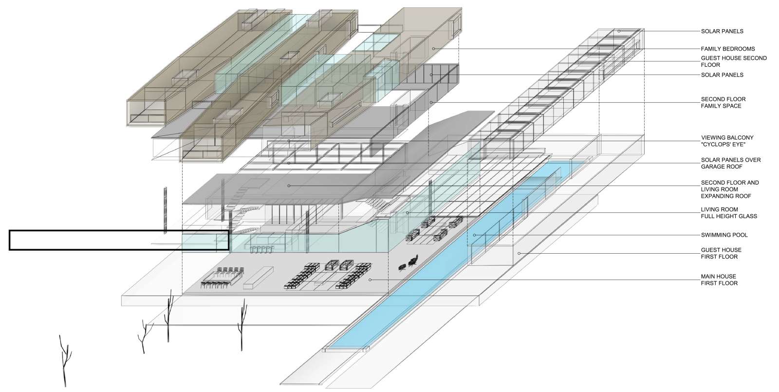 Tri vrstvy sú organizované taktiež z funkčného hľadiska, aby posilnili charakteristiku miesta a maximalizovali udržateľné aspekty projektu týkajúce sa ekológie. Prízemie je dokonale prezentované ako priehľadný sklenený box. Nachádzajú sa tu všetky verejné priestory (obývacia miestnosť, kuchyňa, bazén, záhrada, atď.). Prízemie prostredníctvom otváravej presklenej steny výrazne využíva prirodzené priečne prevetrávanie ako hlavný ekologický prvok.
