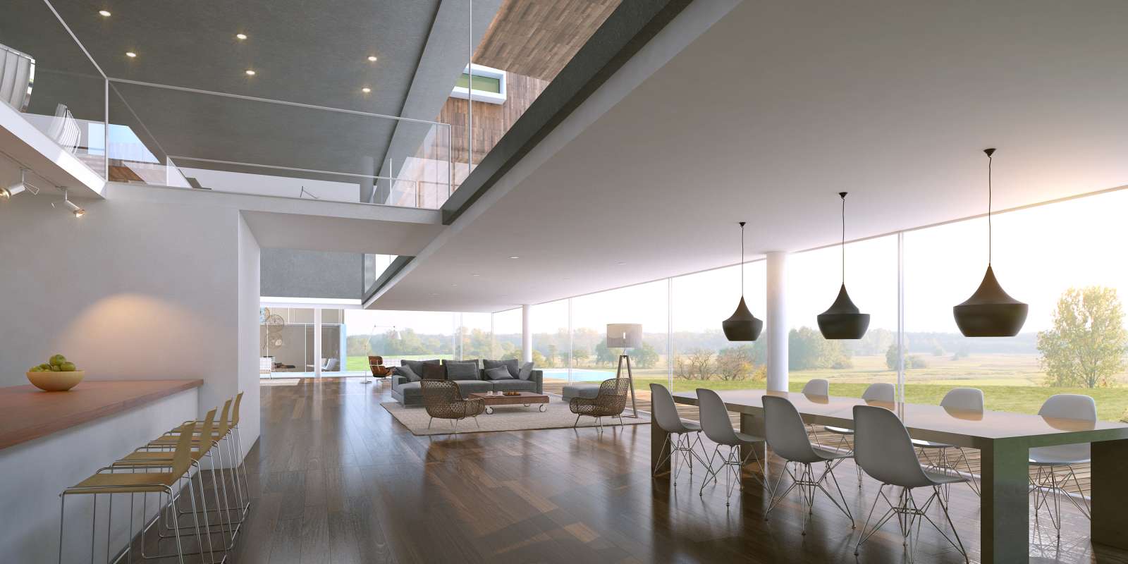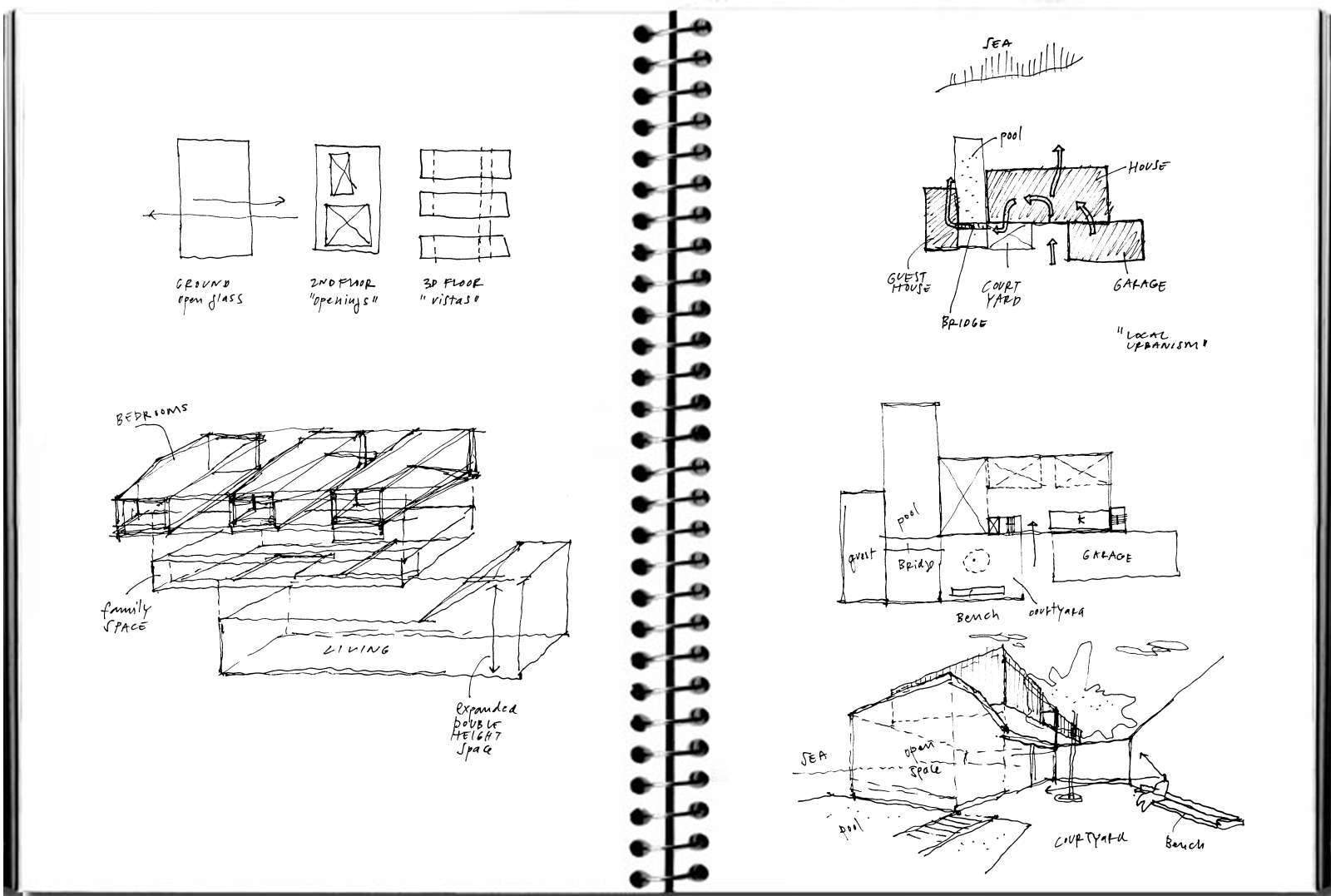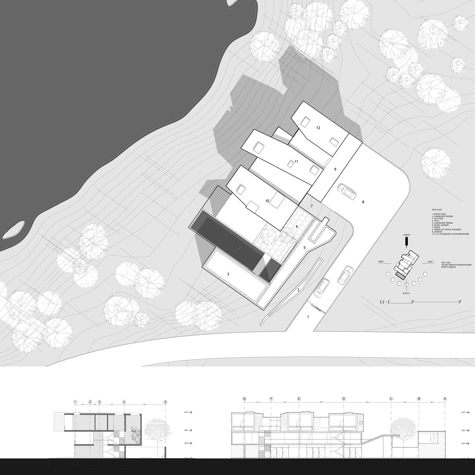 Tri vrstvy sú organizované taktiež z funkčného hľadiska, aby posilnili charakteristiku miesta a maximalizovali udržateľné aspekty projektu týkajúce sa ekológie. Prízemie je dokonale prezentované ako priehľadný sklenený box. Nachádzajú sa tu všetky verejné priestory (obývacia miestnosť, kuchyňa, bazén, záhrada, atď.). Prízemie prostredníctvom otváravej presklenej steny výrazne využíva prirodzené priečne prevetrávanie ako hlavný ekologický prvok.