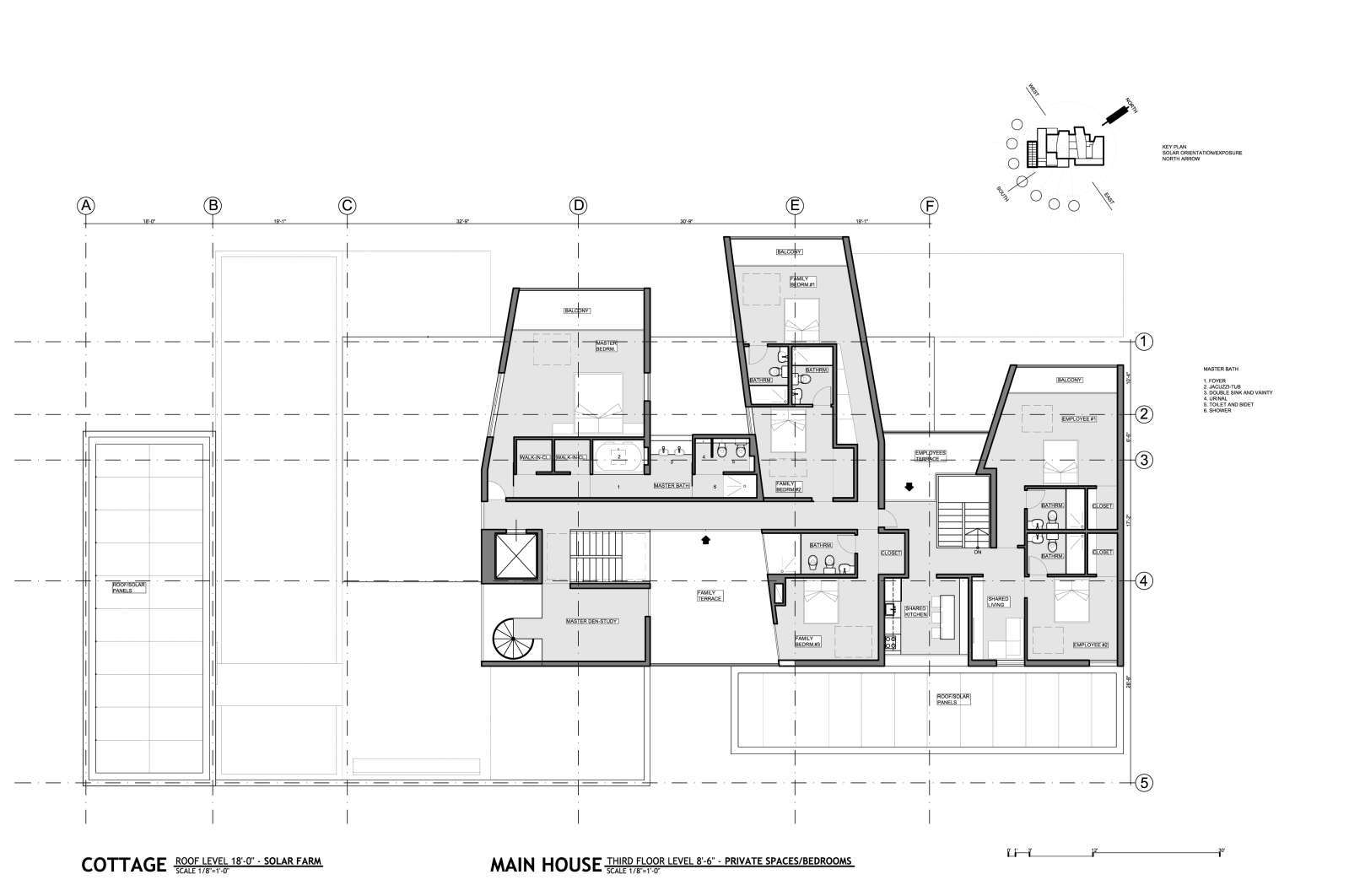 Schodmi a výťahom sa dostanete na tretiu úroveň, kde sa nachádzajú všetky spálne. Spálne, ktoré sú rozdelené na 3 hlavné, drevom obložené časti v tvare periskopov (Kyklopov), sú riešené ako pohodlné a luxusné priestory. Západný „Kyklop“ sa skladá z hlavného apartmánu, hlavnej kúpeľne a súkromnej študovne/pracovne v južnom krídle.