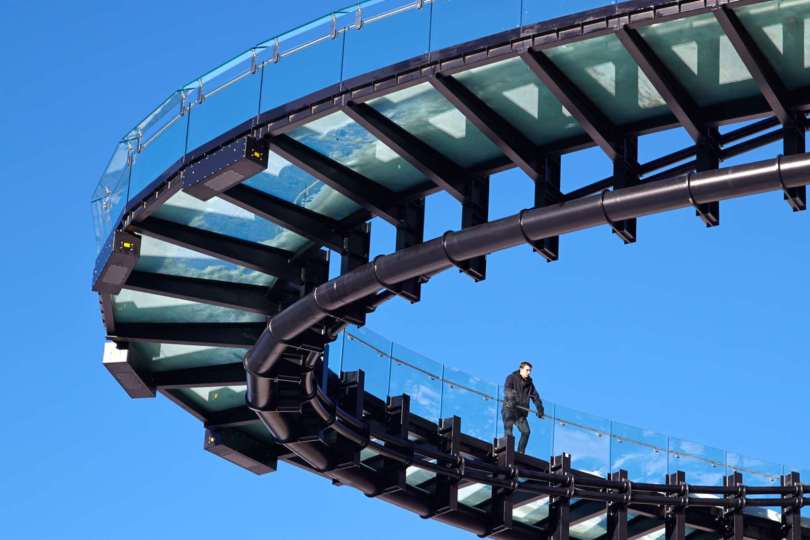 Ako stúpanie pokračuje, narastá vzrušenie, keďže výhľad sa stáva stále viac a viac viditeľný.Nakoniec návštevníci prichádzajú na Vyhliadku. Najprv je výhľad na plošinu a charakter zážitku, ktorý na nich čaká, zakrytý balvanovitou geometriou plošiny. Hneď za Corténovým východom sa nachádza sklenená cesta – priehľadný chodník týčiaci sa na dolinou pod ním. Tu sa môžu návštevníci odvážiť vyjsť 30 metrov od steny útesu a zažiť jeden z najlepších a najvzrušujúcejší výhľadov na svete.