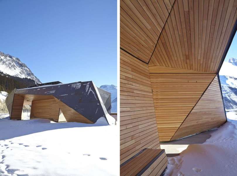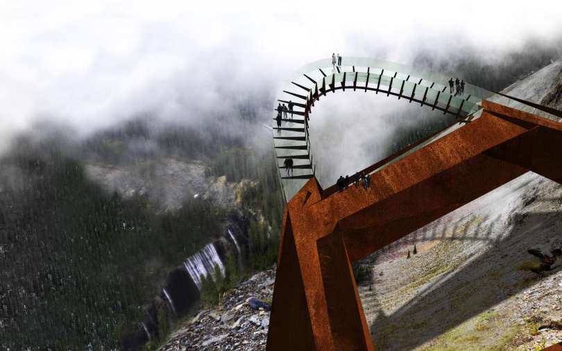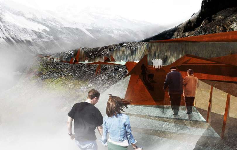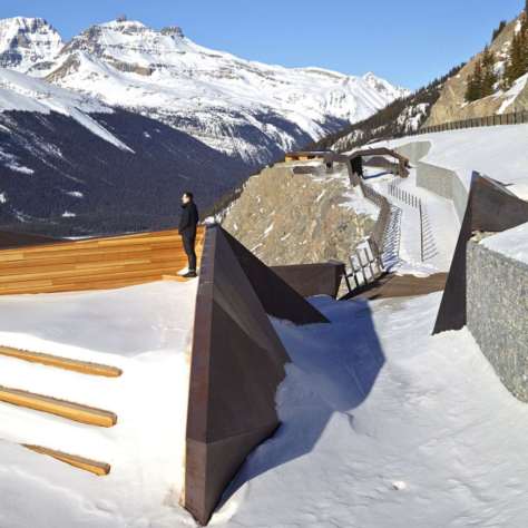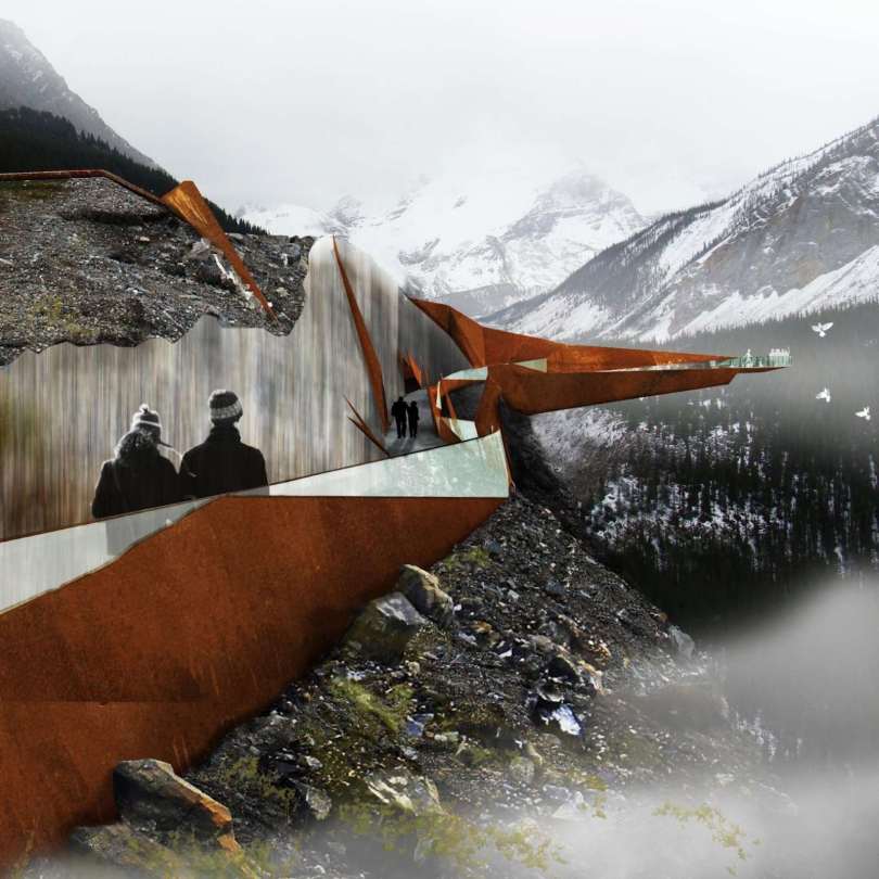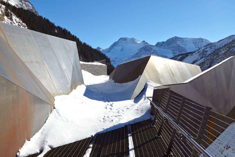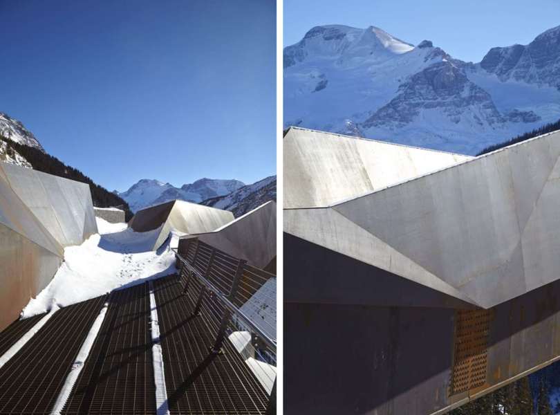 Tvar a história tejto krajiny, tohto miesta, je inšpiráciou pre dizajn a voľby materiálov v projekte. Historický a ekologický príbeh kanadských národných parkov si vyžaduje inováciu v materiáloch a udržateľnom prístupe k výstavbe. Na všetkých odkrytých nevodorovných povrchoch je použitá oceľ odolávajúca poveternostným vplyvom, tak aby ladila s vyfarbením priľahlej skaly, zatiaľ čo údržba a použitý materiál je bez prchavých organických zlúčenín.Hranatá forma jednotlivých častí, hrdzavé zafarbenie a teplá textúra Corténu na oceľovej konštrukcii súvisí so skalnatými výbežkami okolitých hôr, zatiaľ čo zasklenie imituje ľadovcový tok.
