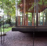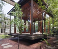 domom miesto na šálku čaju, meditáciu a rodinné hudobné recitály. Projekt sa teda upriamil na nápad umiestniť do záhrady levitujúci „kryštál“ medzi listnatými pňami bambusu.