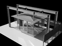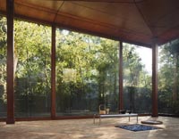 Konštrukčne ide o stavbu, ktorá kombinuje materiály - sklo, drevo, kameň a bronz. Nosná časť je riešená ako priestorový rám, na ktorý je zavesená konštrukcia tvoriaca samotnú miestnosť. Toto nám dáva pocit akoby sa objekt vznášal a umocňuje to aj fakt, že priestor je po obvode celý presklený.
