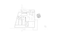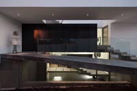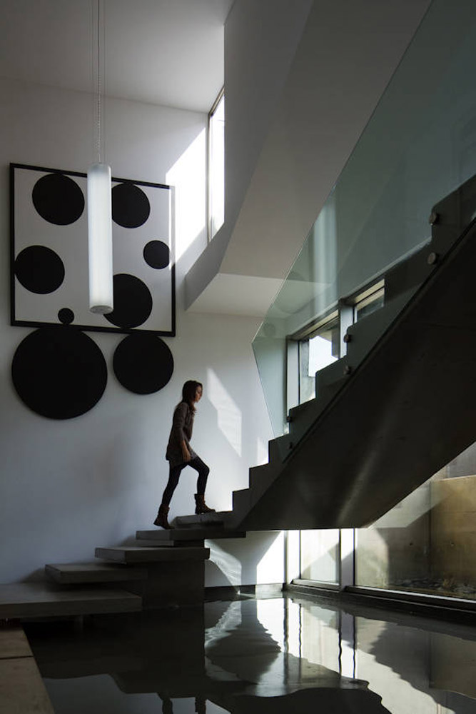 Vchod do domu je rieseny cez betonove premostenie, ktorym sa dostaneme na horne podlazie. Tu mozeme vidiet roznorodost priestoru, v ktorom sa nachadza obyvacia izba, kuchyna a rozlahla spojovacia cast prechadzajuca cez dve podlazia. V tejto casti je osadeny aj bazen s efektom reflexu a schodisko, ktore vyplna cely tento priestor.