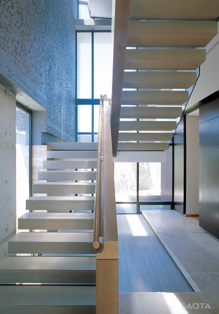 | Cesta smerujúca k „tieniacej stene“, ktorá odráža drsnosť krajiny, je oddelená od obývacích priestorov svetlíkom, ktorý vedie po celej dĺžke domu. Od tohto tieniaceho elementu je dom organizovaný lineárnym spôsobom, pričom všetky miestnosti sú otočené smerom k výhľadu na more. Interiér je minimalistický a v maximálnej miere funkčný. Posuvné zasklenie od podlahy po strop umožňuje otvorenie obývacích priestorov krajine. |