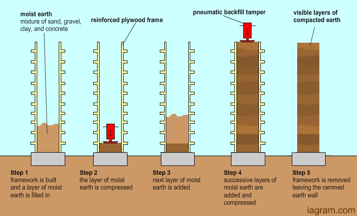 Konštrukciu hutnenej hlinenej steny tvorí piesočný íl bohatý na železo, ktorý je dominantou daného miesta, štrk z priľahlej rieky a voda z miestneho vrtu.