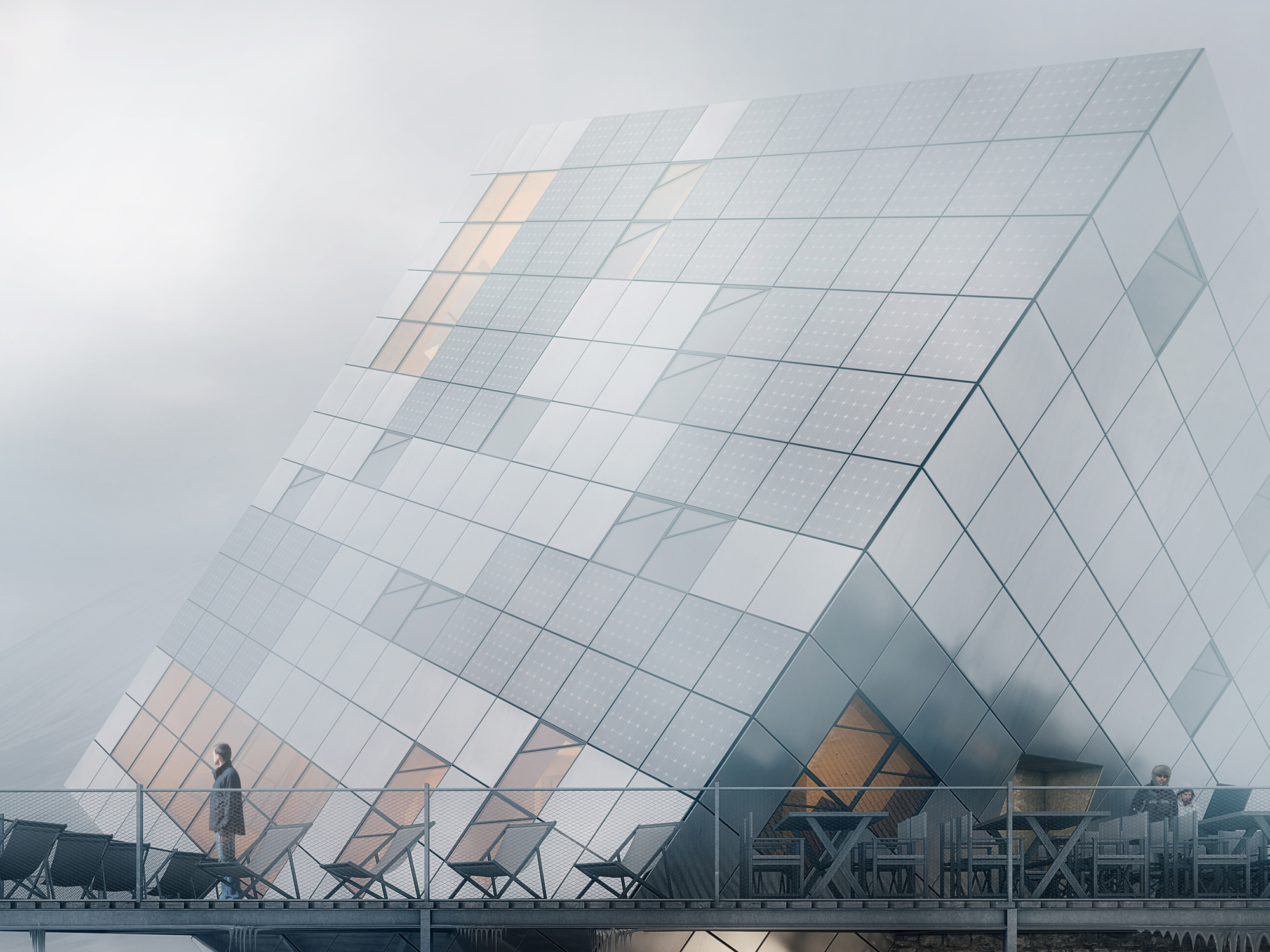 “Vďaka osadeniu stavby sú tri strany fasády viditeľné z akéhokoľvek pohľadu, čo podporuje hru svetla a tieňov – ten istý efekt môžeme pozorovať na okolitých skalách,“ uvádza Atelier 8000. „Presklené plochy okien a fotovoltických panelov spolu s ľahkou transparentnosťou plechového obloženia dopĺňajú celkový obraz miesta o ligot – presne ako odlesky a odrazy, ktoré je možno vidieť na hladine plesa alebo povrchu topiaceho sa ľadu.”