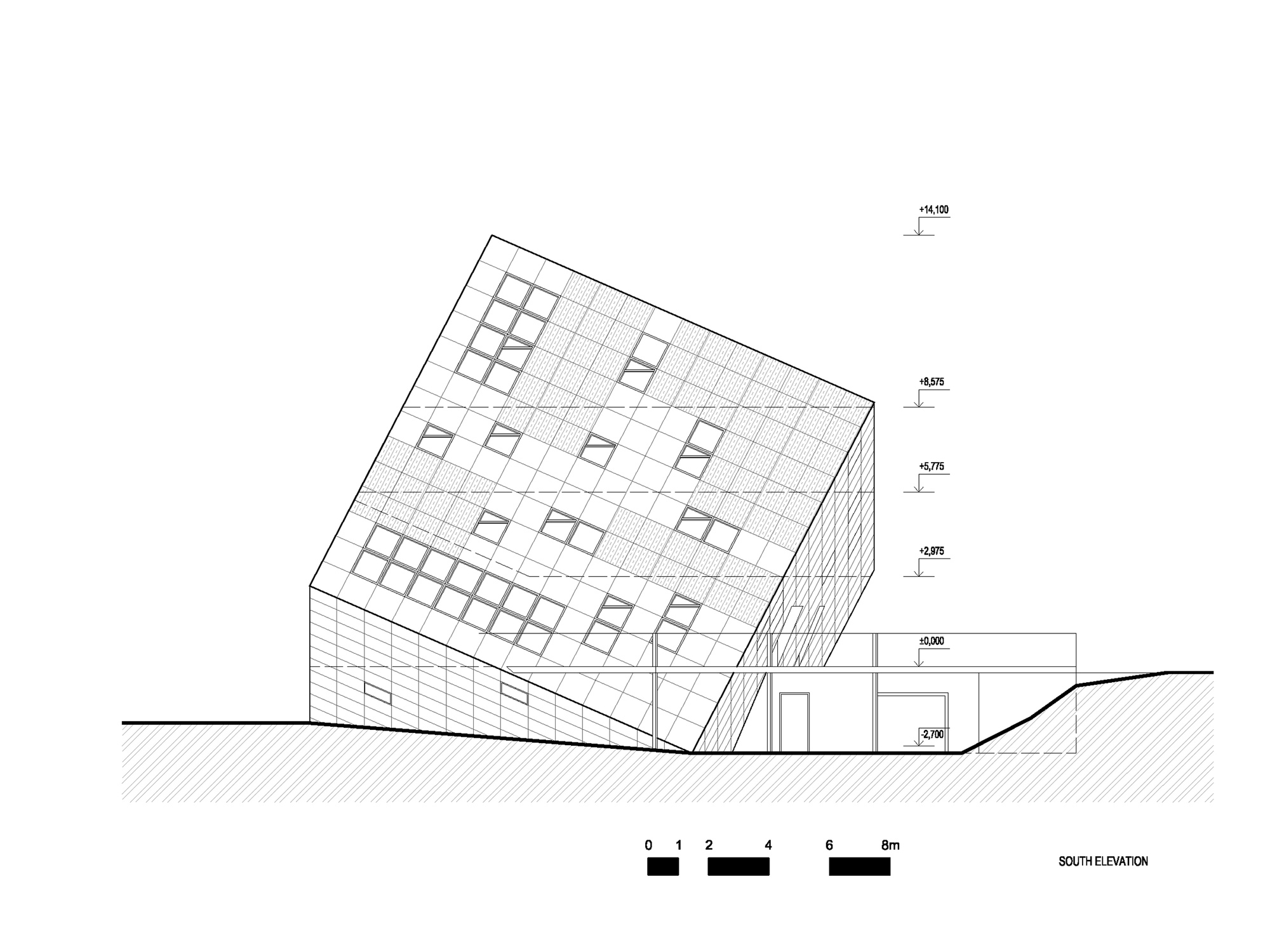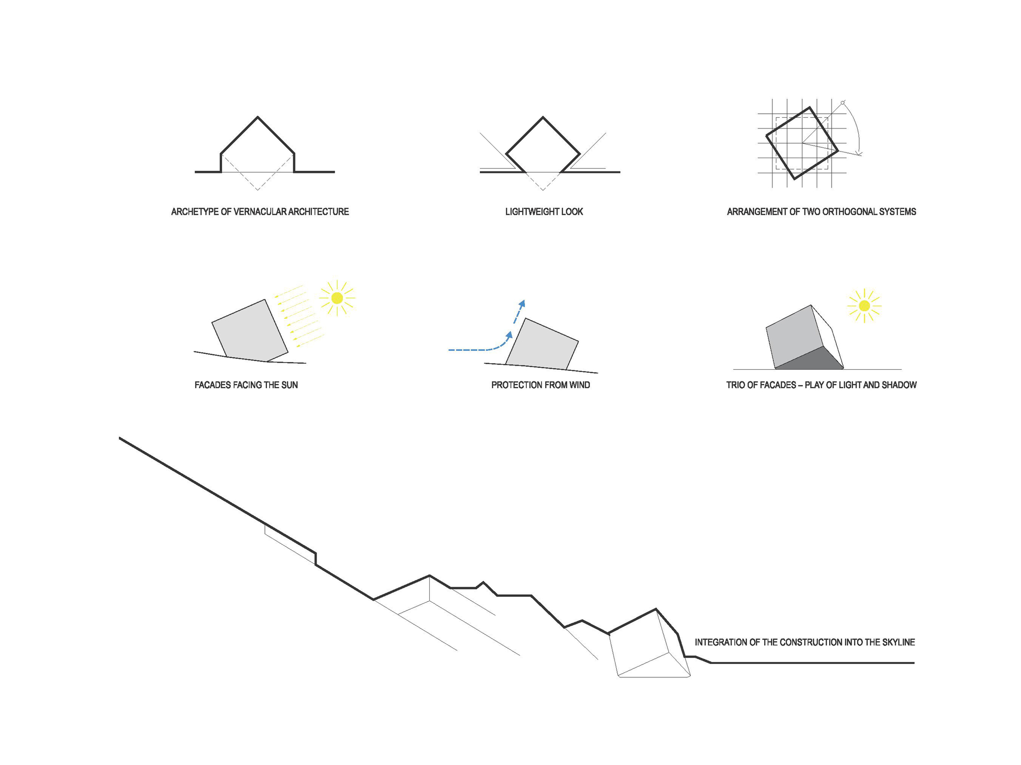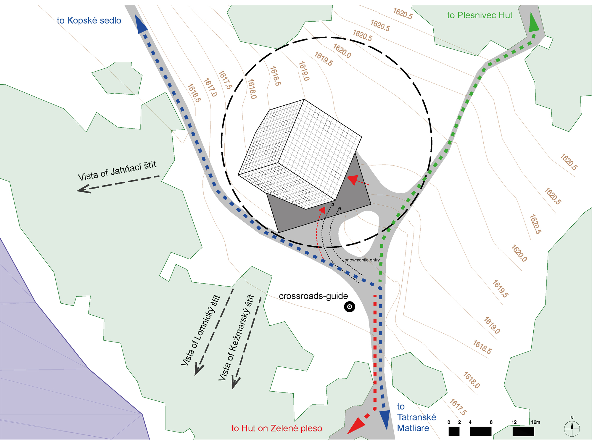 Samotnému návrhu štúdia Atelier 8000 dominuje jednoduchá kocka osadená na jednom z jej vrcholov. Objekt evokuje bludný balvan, ktorý za sebou zanechal ustupujúci ľadovec, zatiaľ čo jeho ostré hrany zapadajú do pozadia hôr.