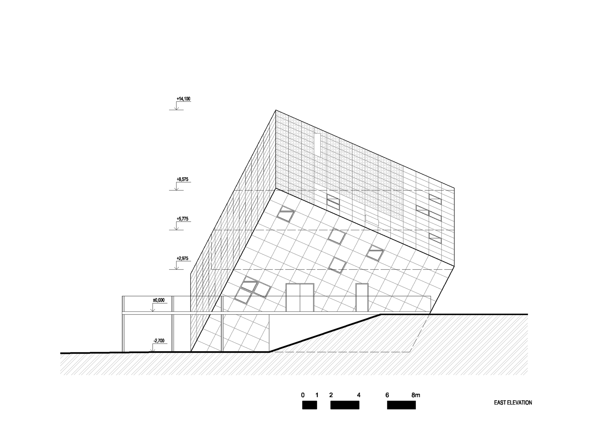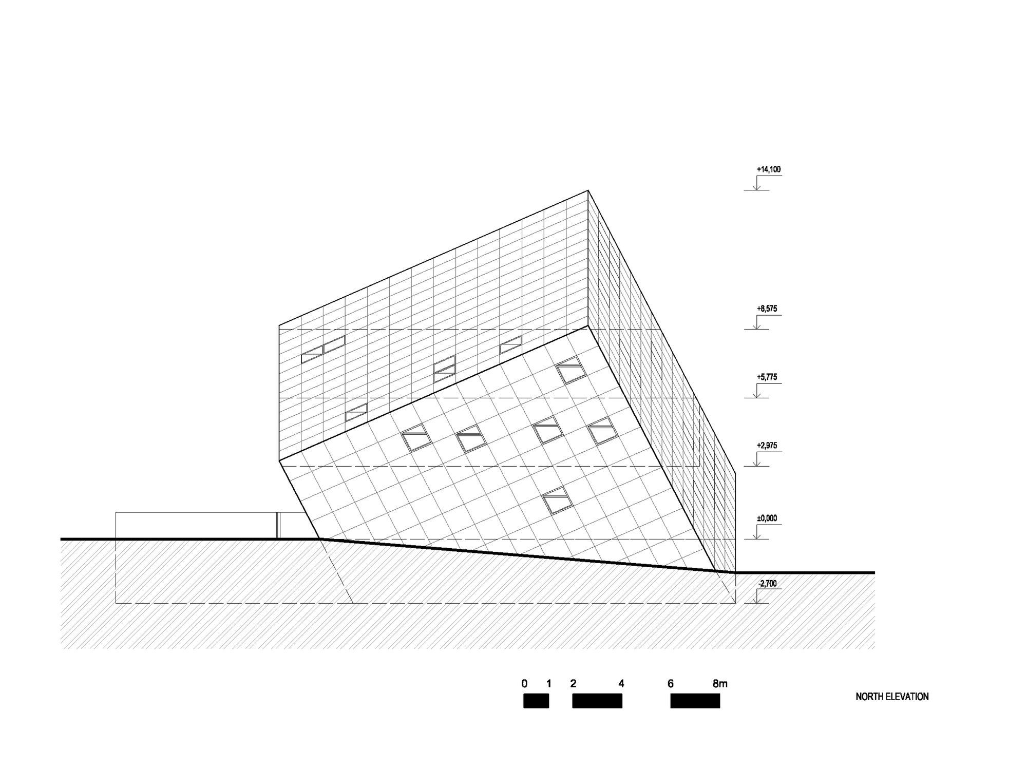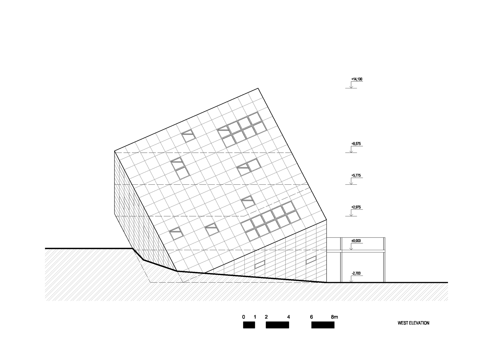 Samotnému návrhu štúdia Atelier 8000 dominuje jednoduchá kocka osadená na jednom z jej vrcholov. Objekt evokuje bludný balvan, ktorý za sebou zanechal ustupujúci ľadovec, zatiaľ čo jeho ostré hrany zapadajú do pozadia hôr.