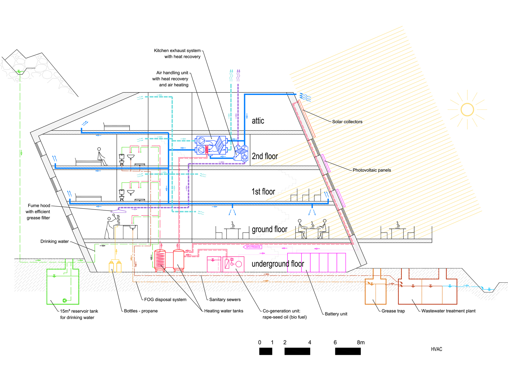 Z hľadiska výroby a spotreby energie je chata navrhnutá ako pasívna budova. Jej tvar a orientácia maximalizujú slnečnú energiu, zatiaľ čo časti fasády s jednotkami na výrobu energie sú orientované južne a východne, aby boli otočené priamo proti slnečným lúčom.